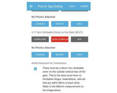An important feature of the Inspection Report is that all relevant Australian Standards are contained in the same report. This allows you to easily complete inspections where there are ‘multiple barrier standards’ to be met. (For example, where a pre-1991 pool has a new glass barrier on one side of the pool).