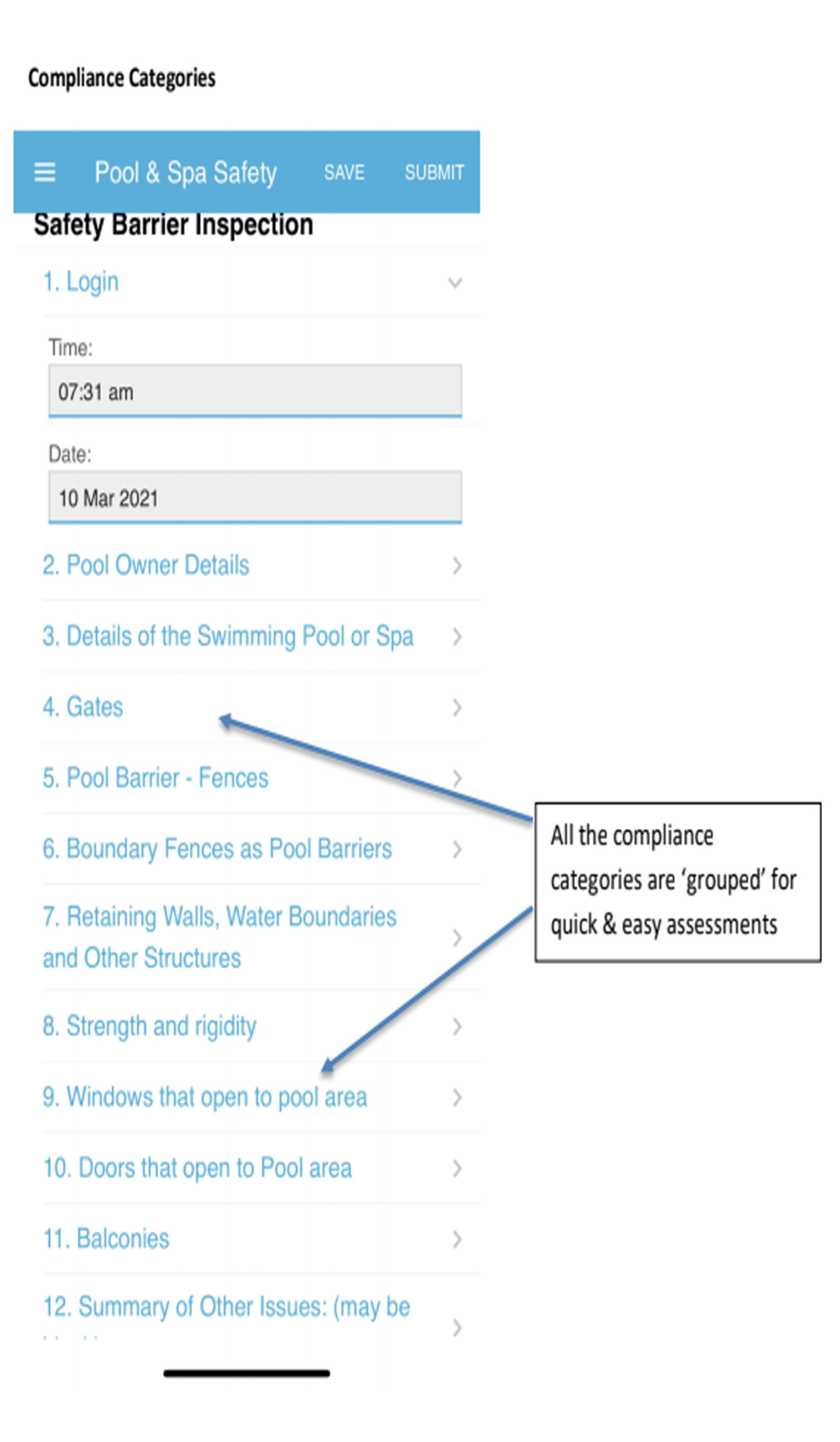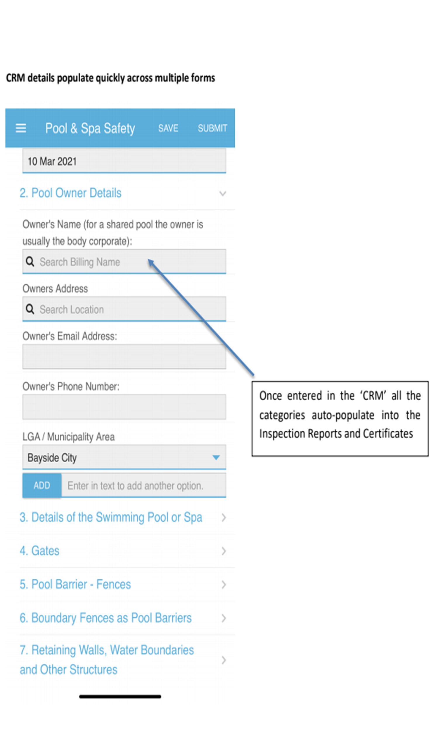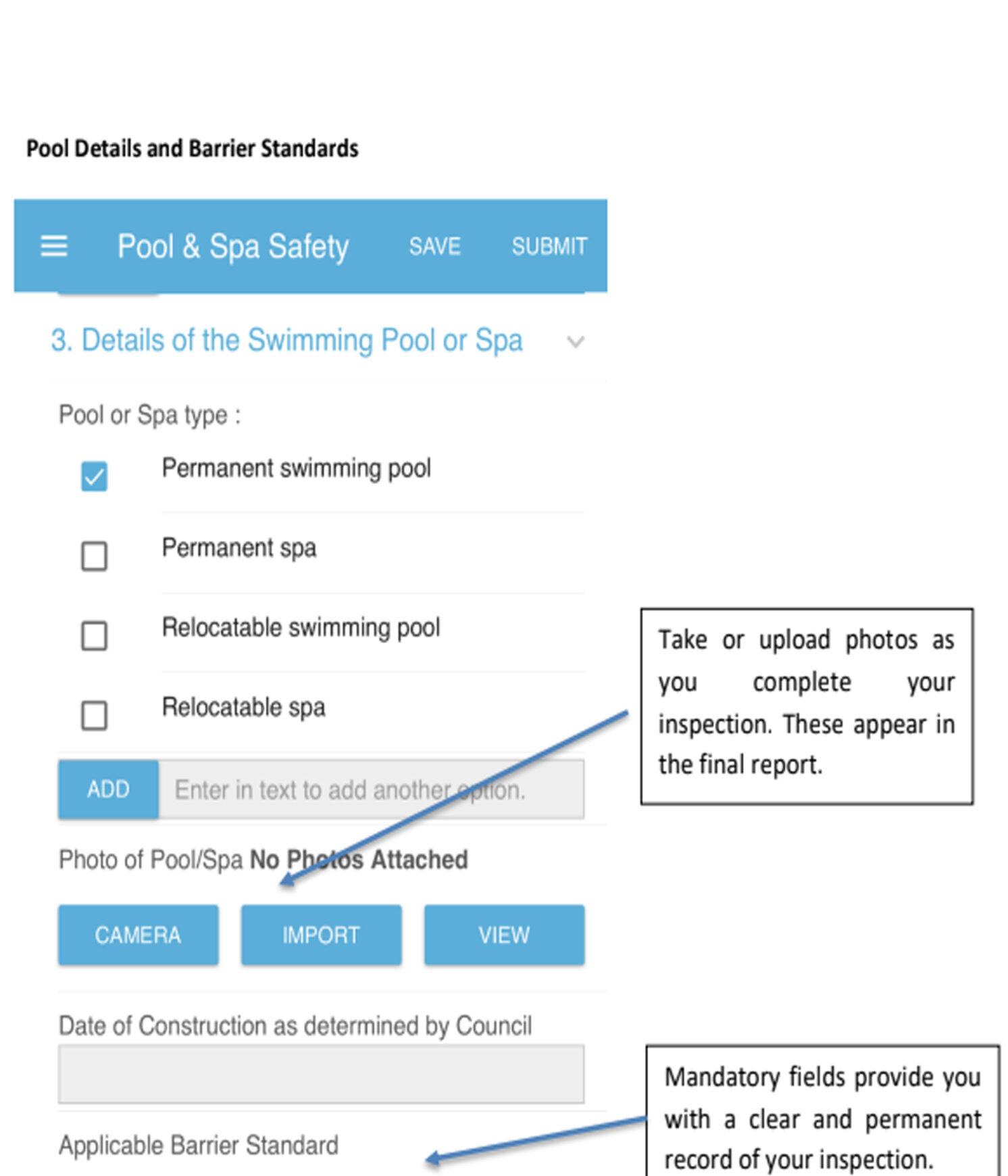 Pool inspectors are legally required to maintain inspection records for 10 years. Cross-referencing inspection photographs with a hard-copy report is not only time consuming and potentially inaccurate, but results in a product that looks less than professional. Whilst other ‘online Inspection Apps’ exist, they do not contain the vast array of ‘tick box’ information fields that allow for quick inspections (as seen on right), limiting the quality and quantity of information that is captured.