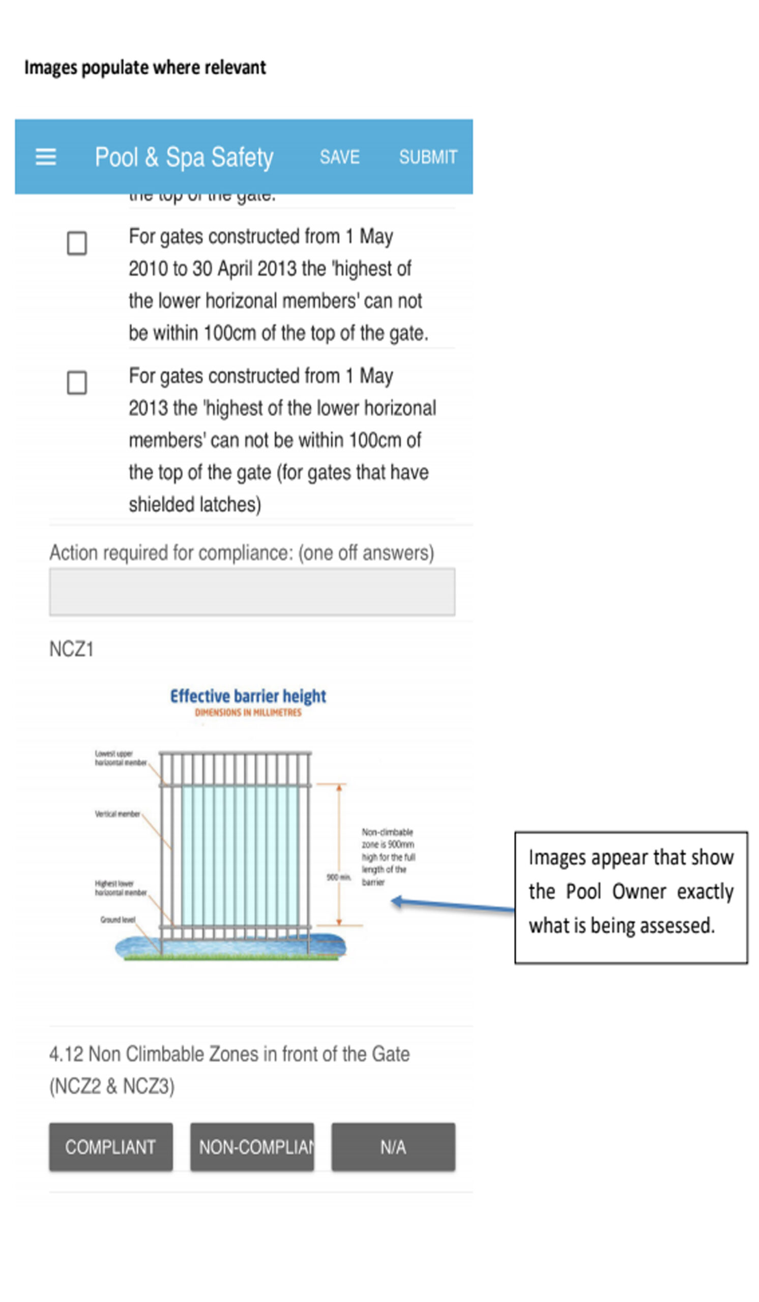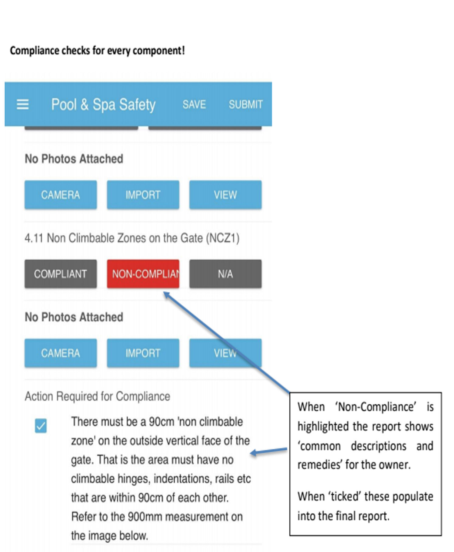 Our templates are designed to enable quick assessments for each component of the barrier. You can select pre-populated remedies and insert photos, images and diagrams that will assist the Owner to understand what they must do to achieve compliance. You can trial this form for free!! (See below)