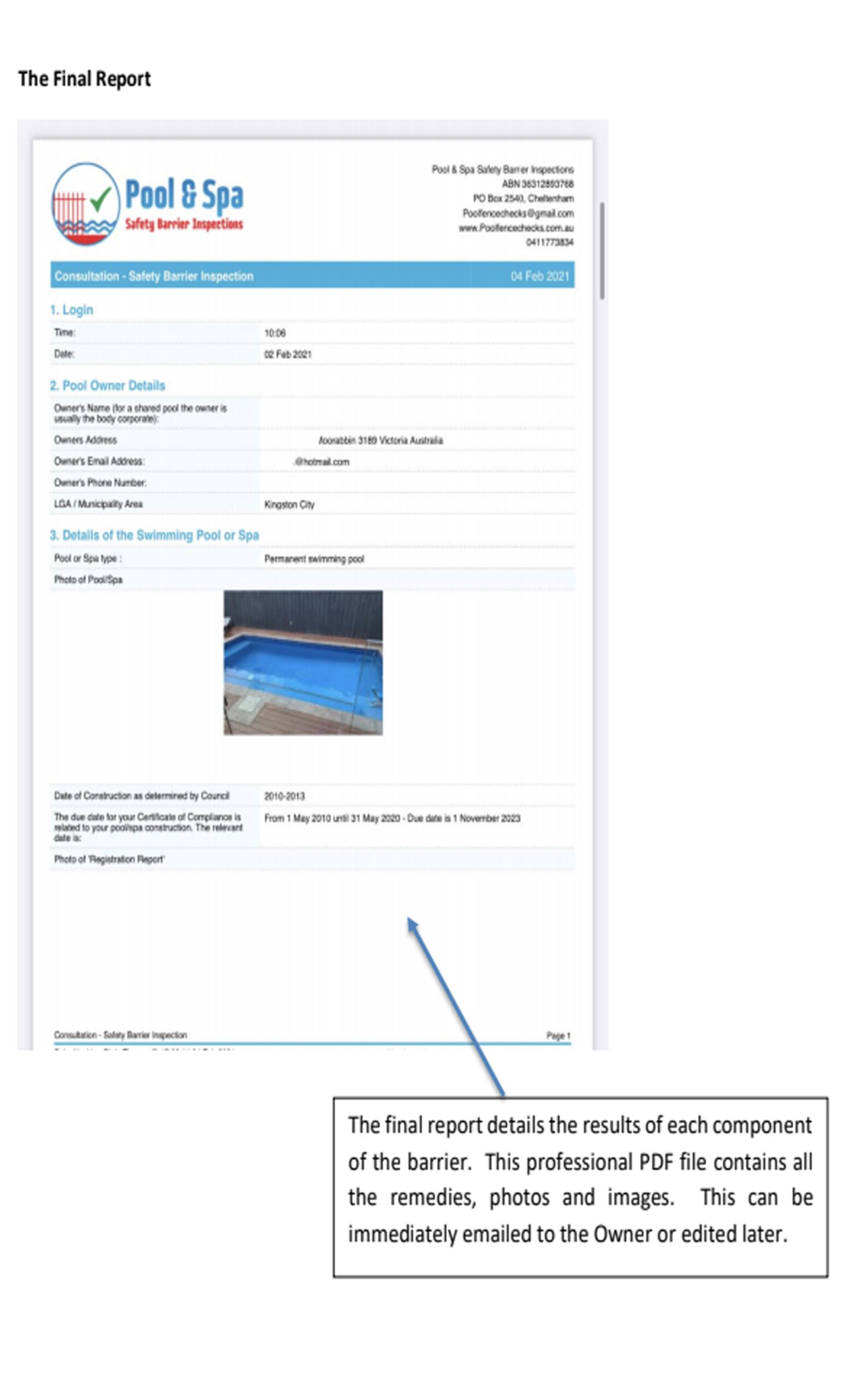 An important feature of the Inspection Report is that all relevant Australian Standards are contained in the same report. This allows you to easily complete inspections where there are ‘multiple barrier standards’ to be met. (For example, where a pre-1991 pool has a new glass barrier on one side of the pool).
